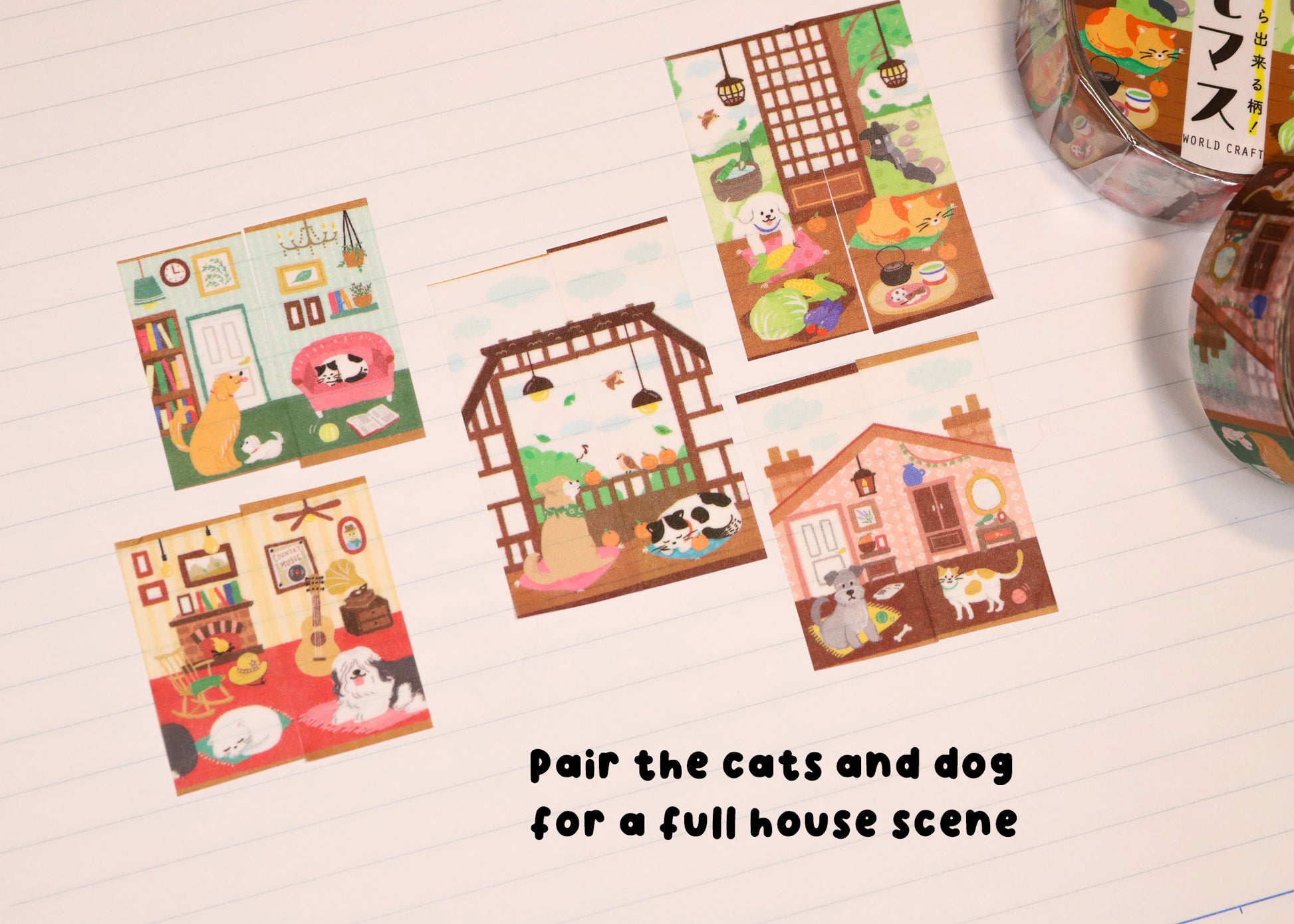 A unique vertical washi tape featuring cats and dogs in cozy houses. Pair them together to make cute little homes.