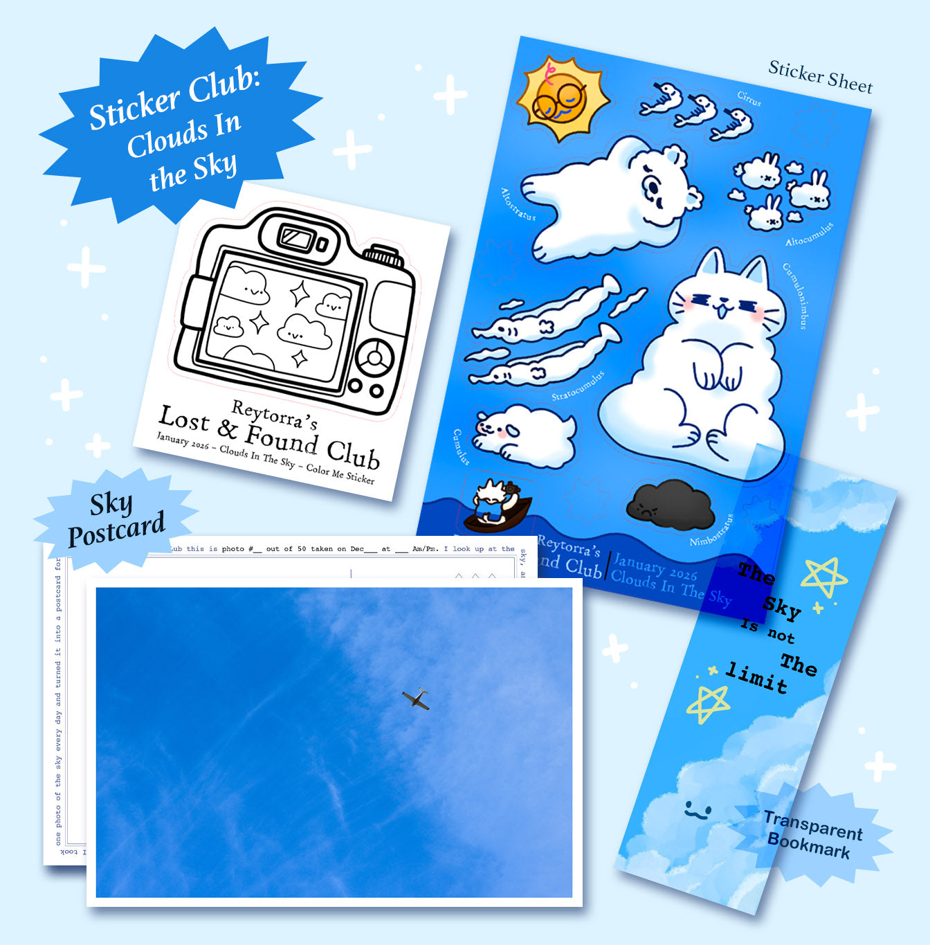 Welcome to Reytorra's Lost & Found Sticker Club! This month, we're finding calmness by staring at the clouds ~ Each month, I'll send you a curated envelope filled with goodies to help you find and grow your inner spark. 𖥔 ݁ ₊